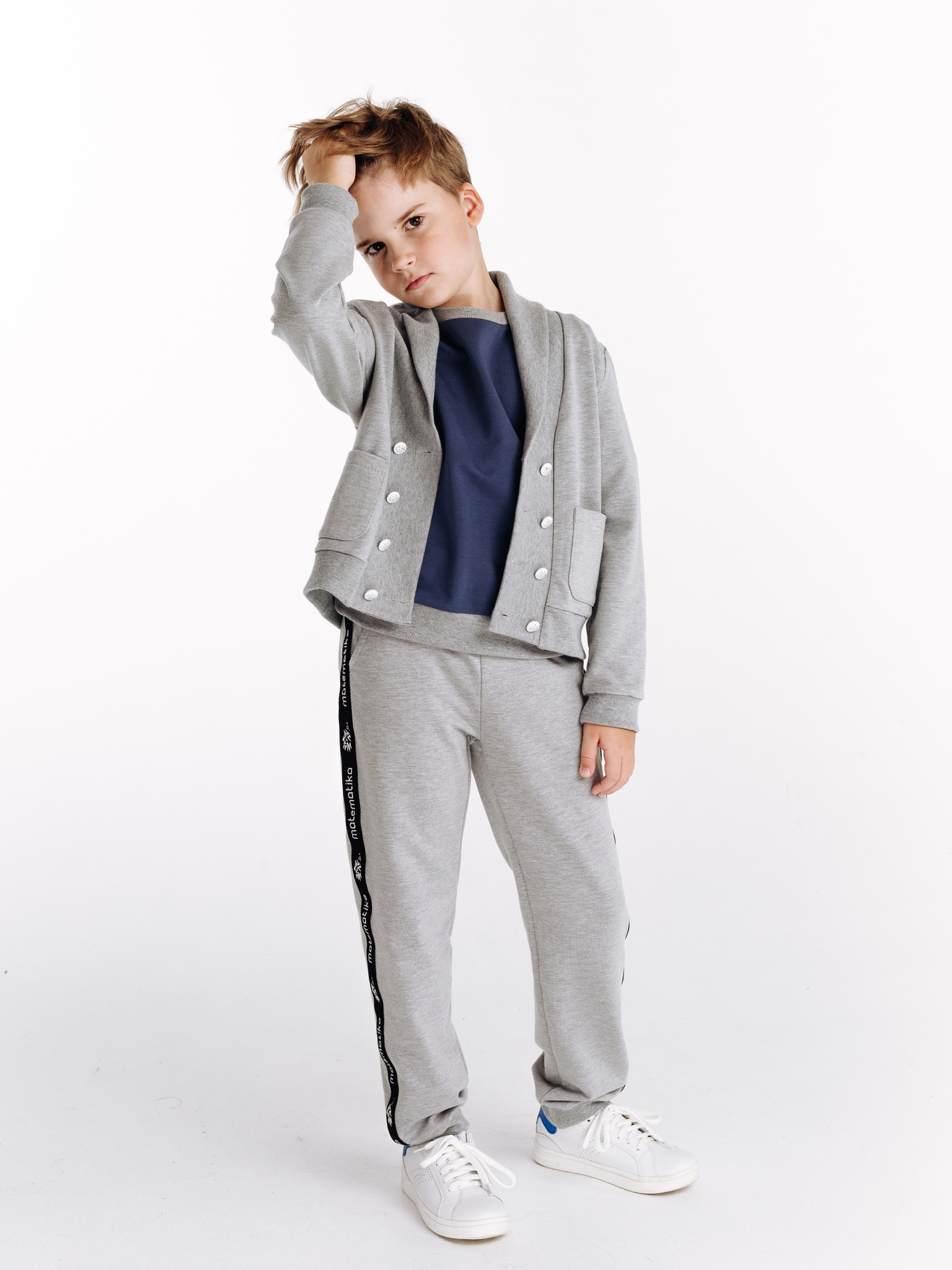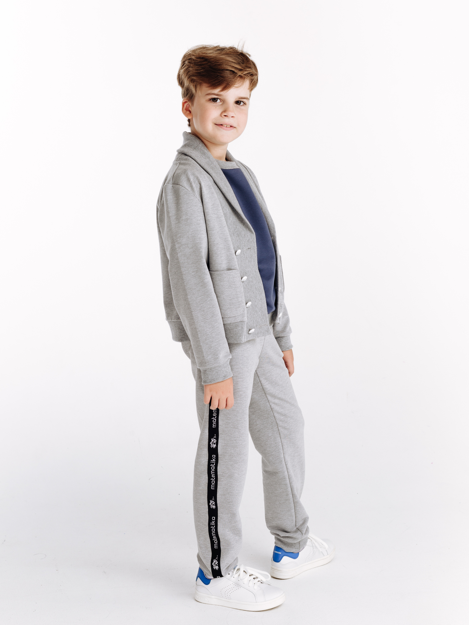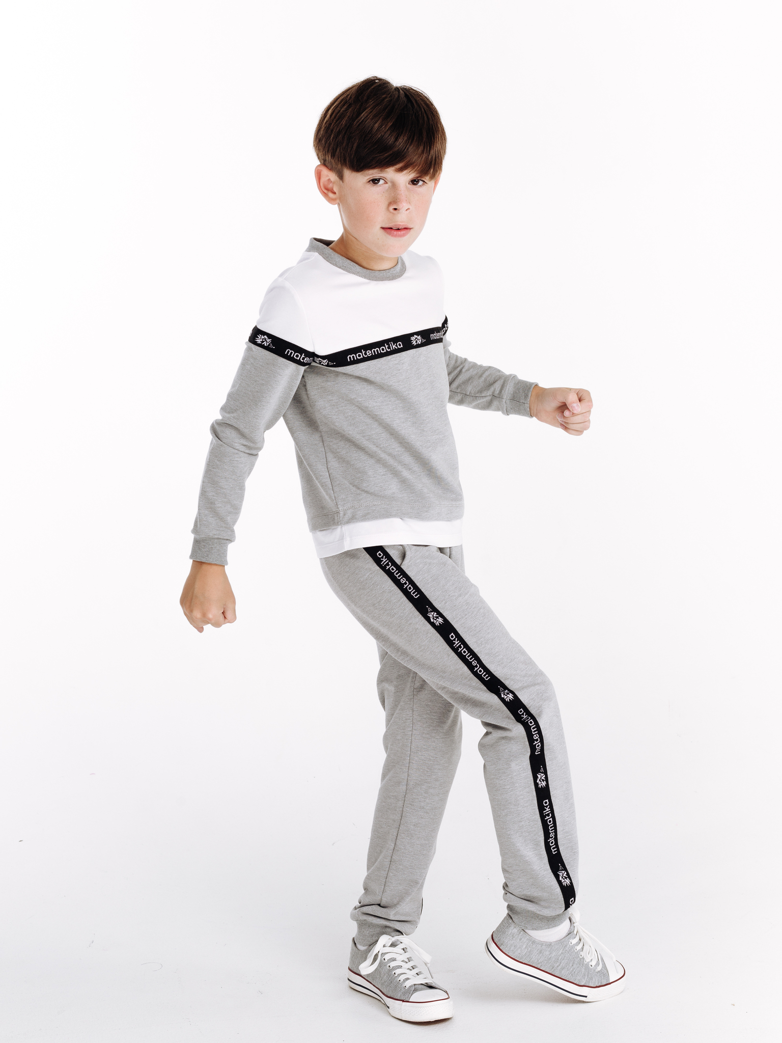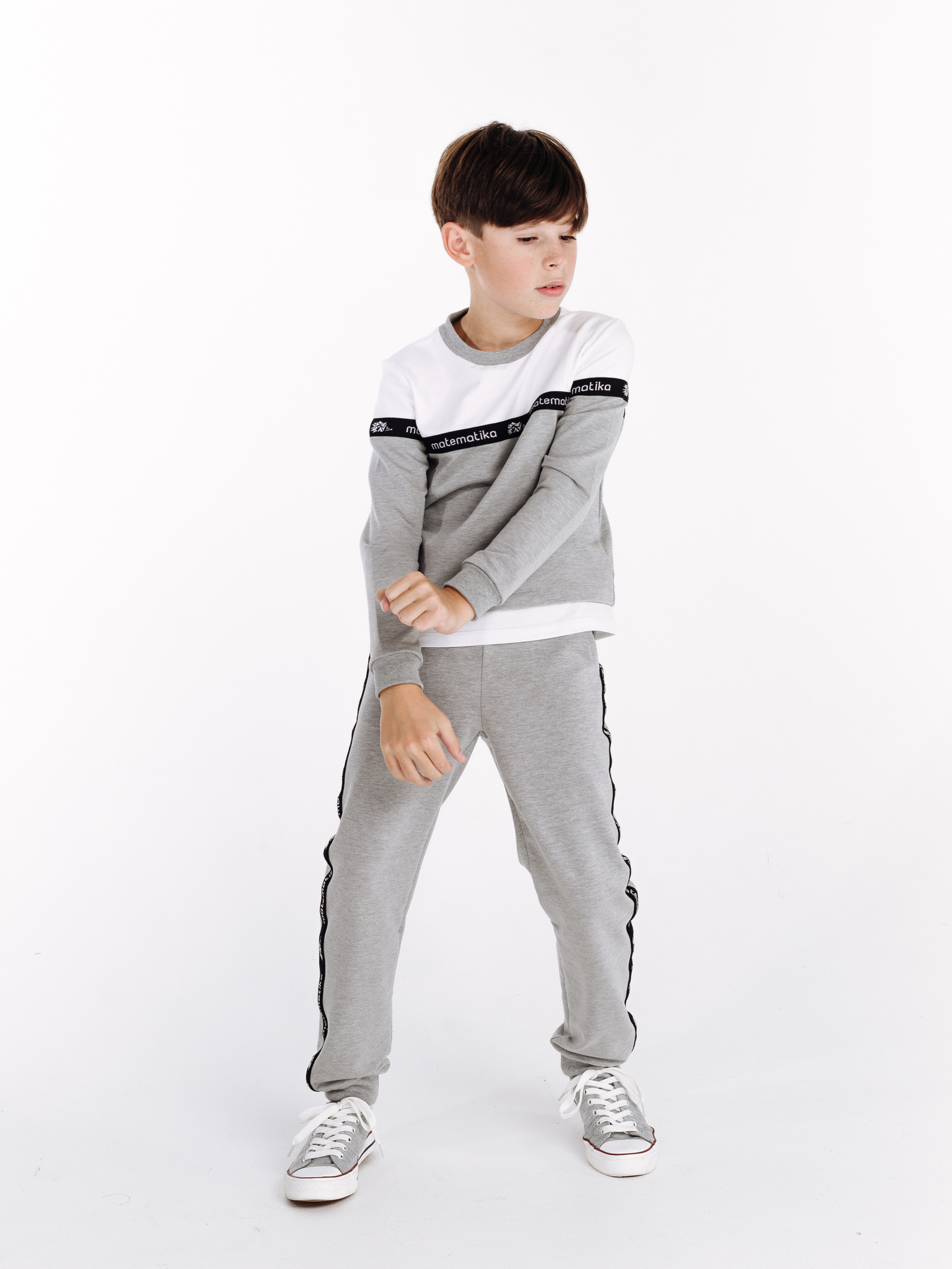 Классические трикотажные брюки-спорт от бренда детской одежды matematika. Брюки выполнены из высококачественного тончайшего трикотажа типа футер двунитка самого благородного из существующих "спортивных" цветов одежды - жемчужно-серого цвета с эффектом мелланж.