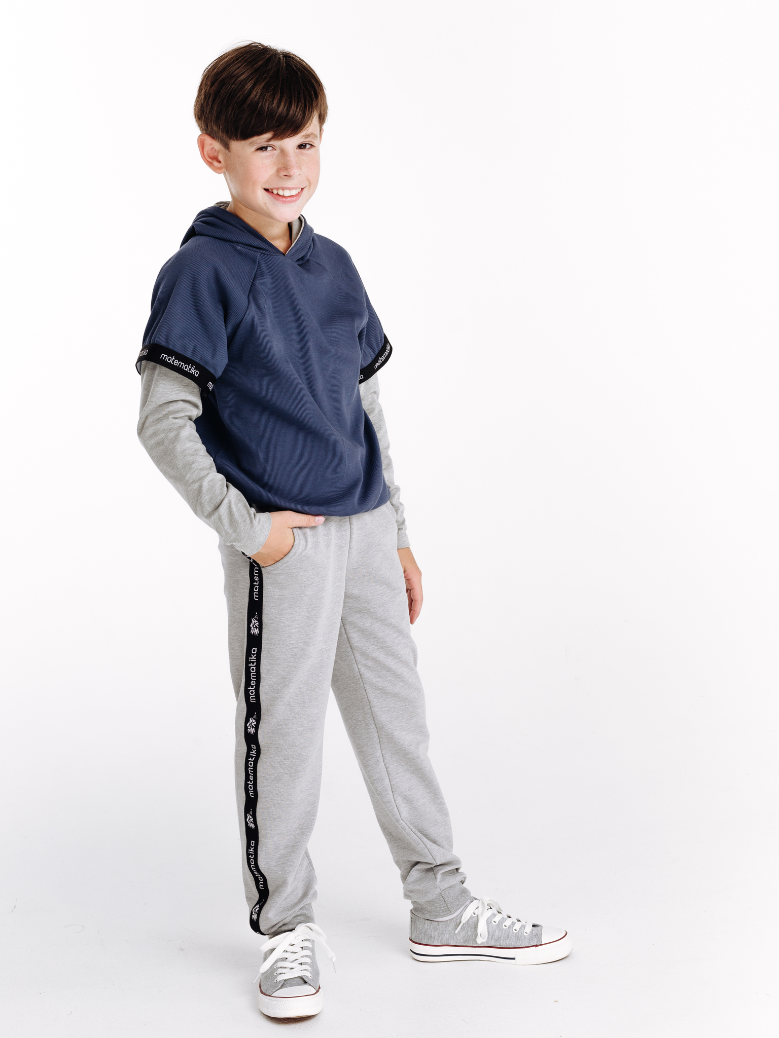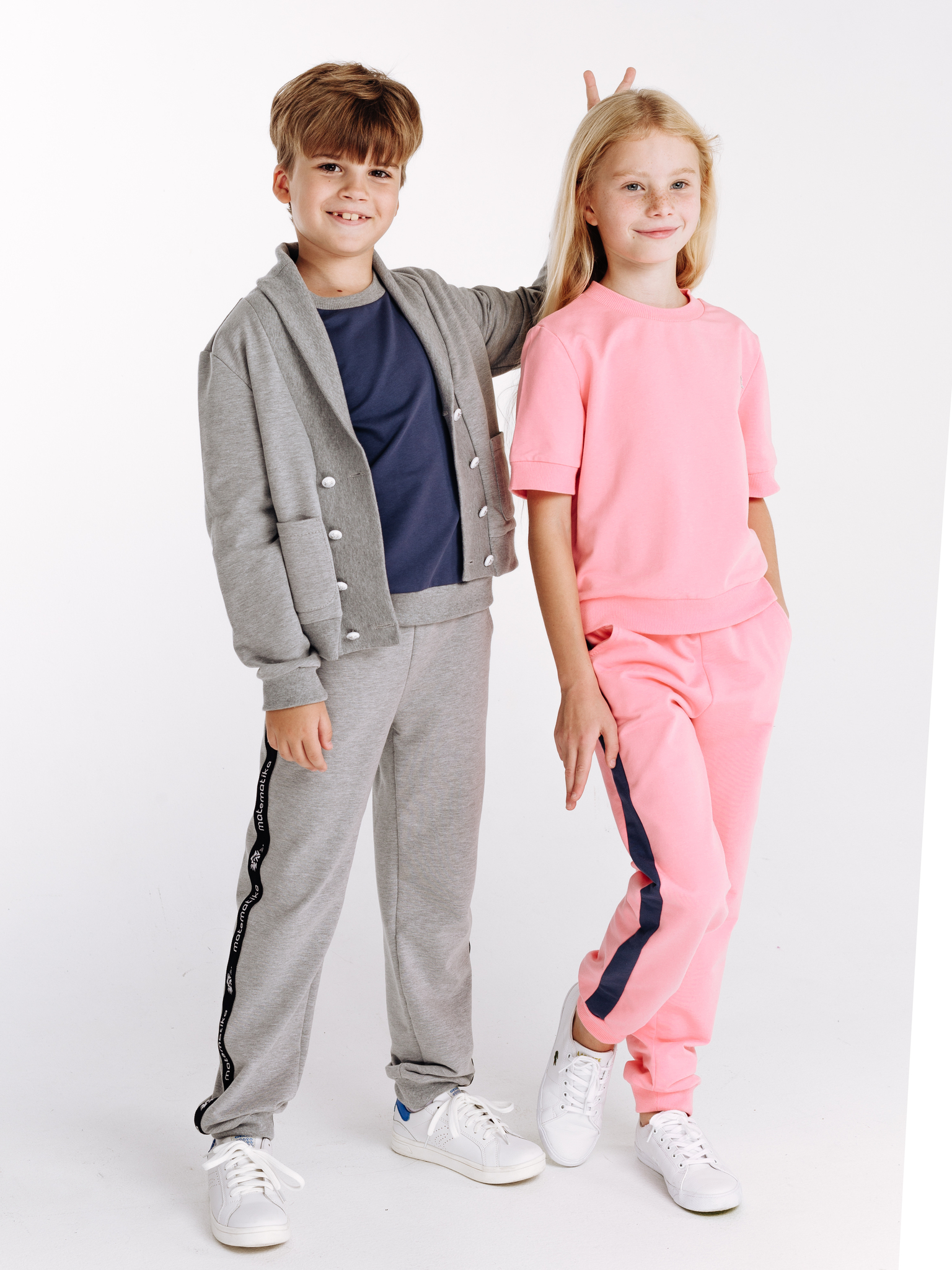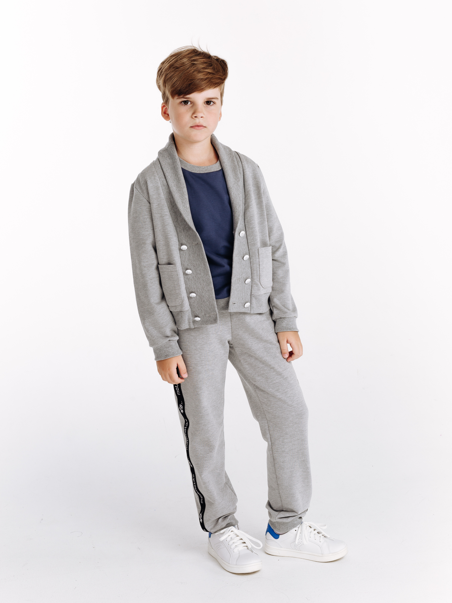 Классические трикотажные брюки-спорт от бренда детской одежды matematika. Брюки выполнены из высококачественного тончайшего трикотажа типа футер двунитка самого благородного из существующих "спортивных" цветов одежды - жемчужно-серого цвета с эффектом мелланж.