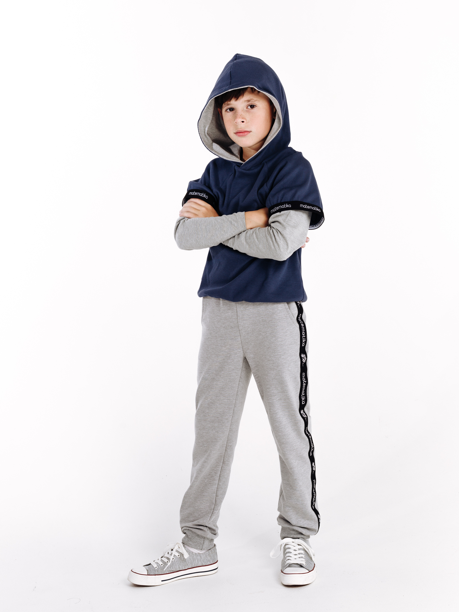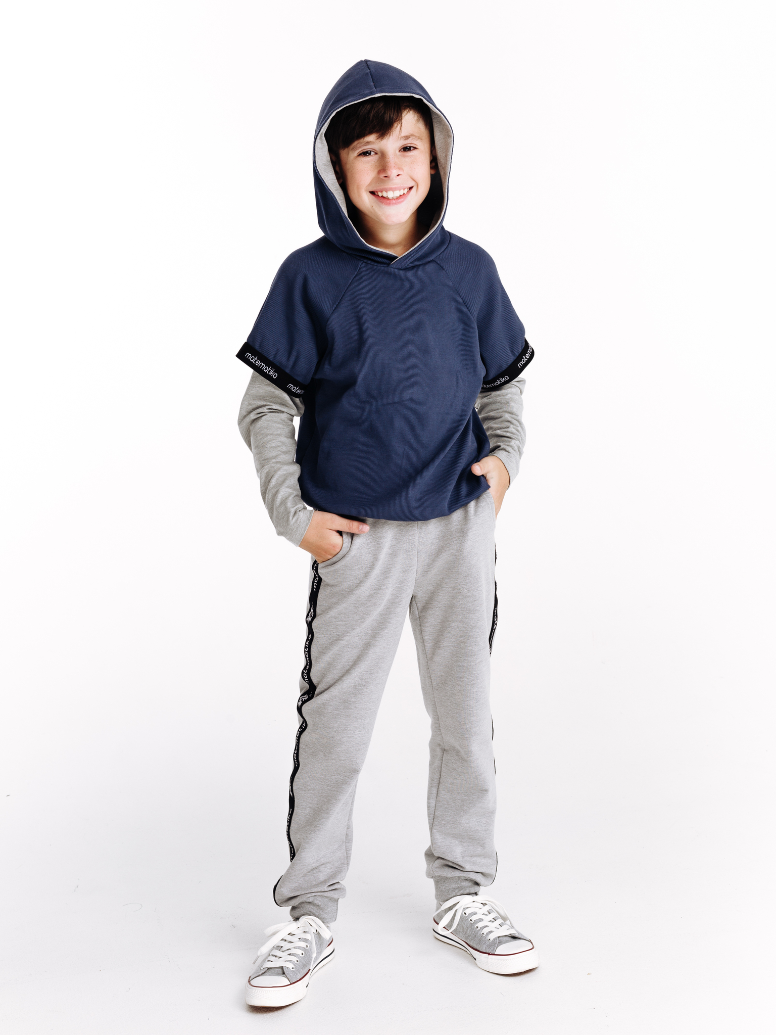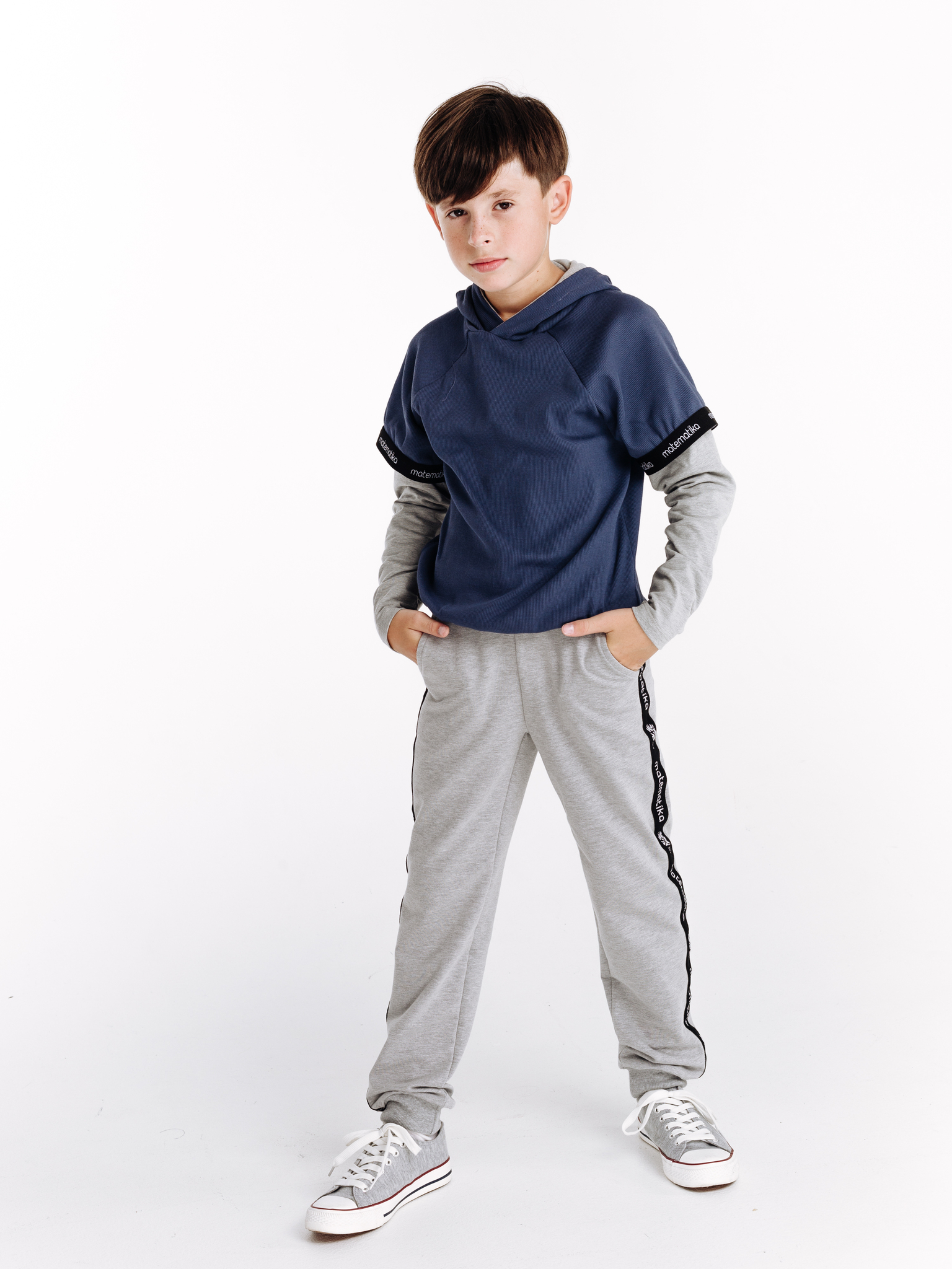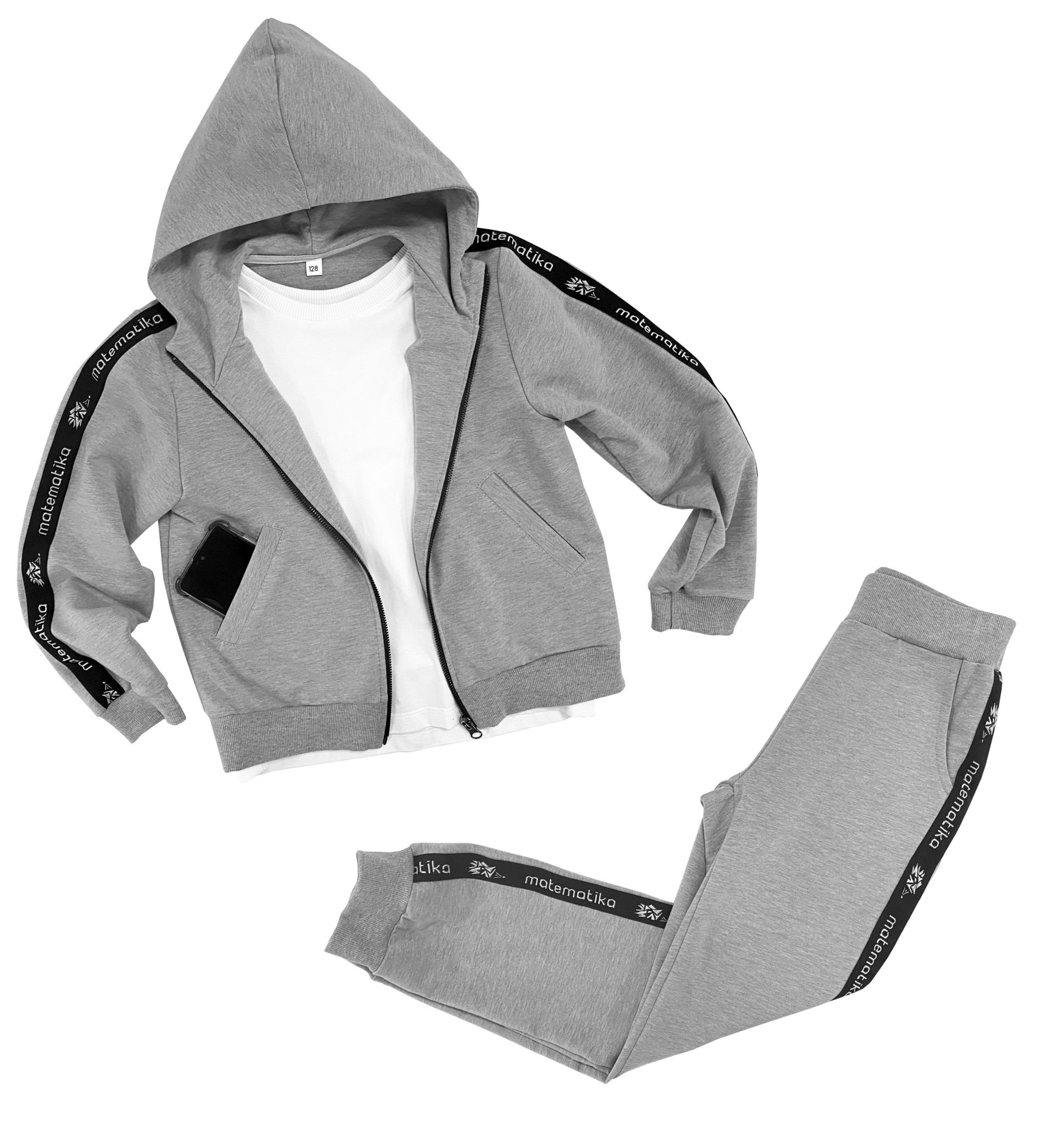 Классические трикотажные брюки-спорт от бренда детской одежды matematika. Брюки выполнены из высококачественного тончайшего трикотажа типа футер двунитка самого благородного из существующих "спортивных" цветов одежды - жемчужно-серого цвета с эффектом мелланж.